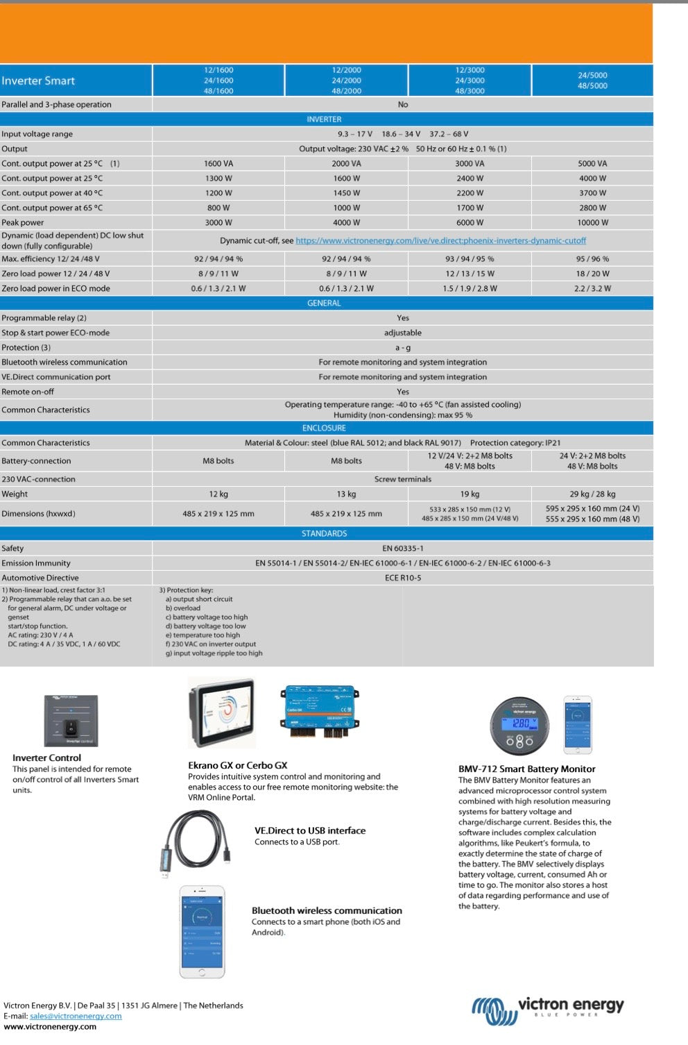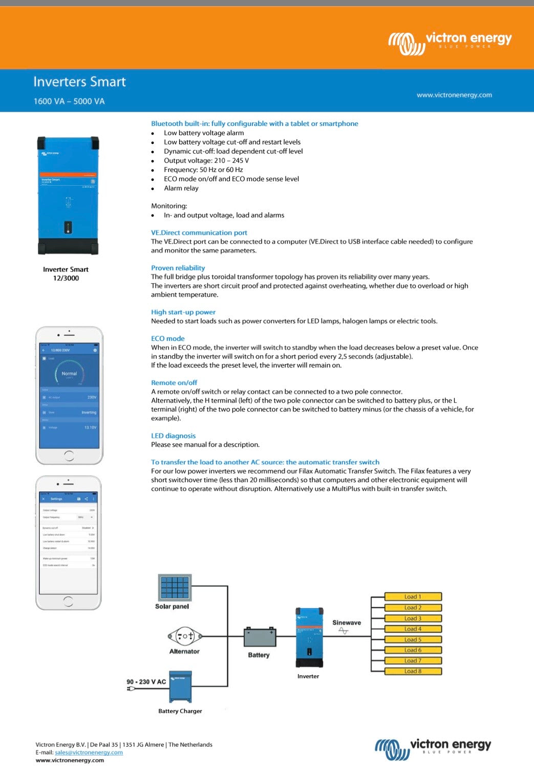 The design criteria have been to produce a true sine wave inverter with optimised efficiency but without compromise in performance. Employing hybrid HF technology, the result is a top quality product with compact dimensions, light in weight and capable of supplying power, problem-free, to any load.