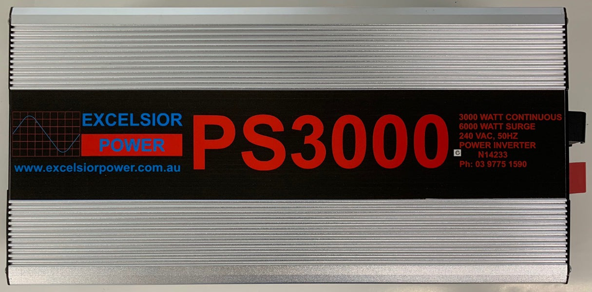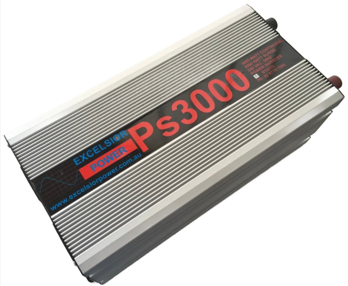 The Excelsior Power PS3000/12 Inverter provides clean, silent 240 VAC power for your mains appliances from 12 volt battery power. The PS3000/12 provides a pure sine-wave output, which is the cleanest power available for those applications that require the very cleanest & purest in power. They are microprocessor controlled and have full electronic fault protection. They also have LED indicators to indicate Power and Fault conditions. The unit also features a very low standby current to save power