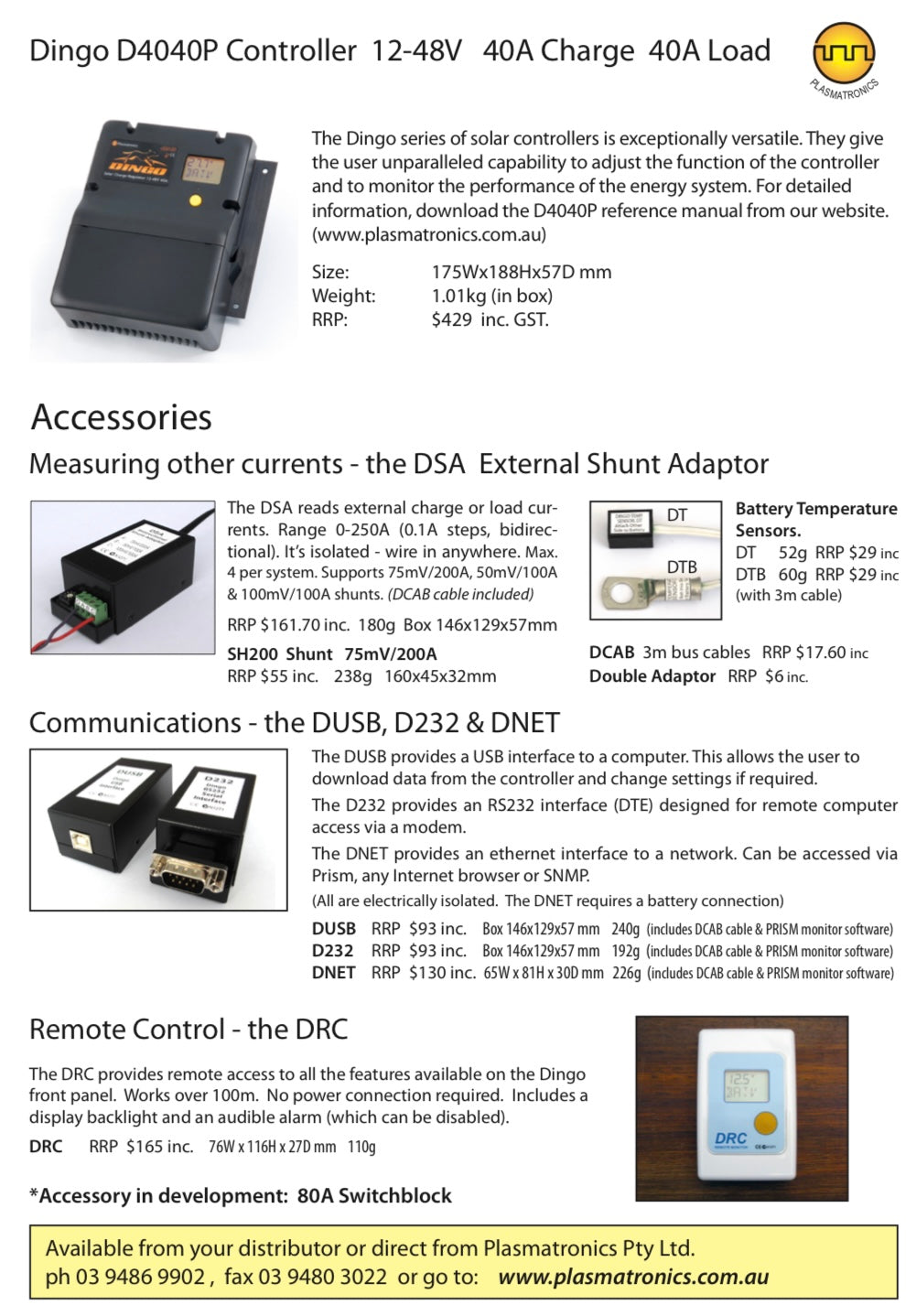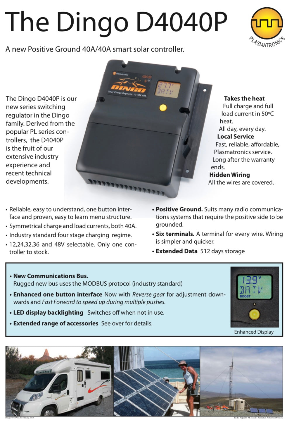 FEATURES: Charge state LCD indicator, Battery Voltage & Amp Hours in & out of battery, Full electronic protection.