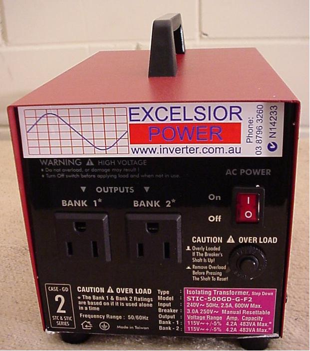 The Excelsior Power SD1000 step down transformer provides clean, silent 120 VAC power for your US appliances from 240 vac power. Ideal if you have a motor home or boat imported from the US. Saves rewiring the motor home/boat to 240 volt. Just plug into the converter, then into normal 240 vac mains/generator. The unit also doubles as an isolation transformer, for extra safety. They simply plug into standard 240 vac, 10 amp socket, have 2 US style sockets, power on switch, power indicator and Circuit breaker for extra safety.